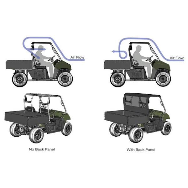 If you put on a front windshield on your General, you should add one on the back. Not doing so creates a venturi effect when you’re driving. Dust and extra wind will get sucked into your machine.